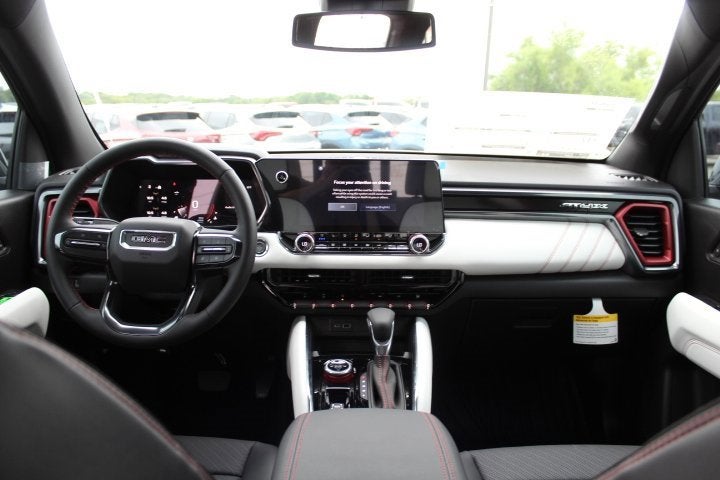 Equipped with AT4 Premium Package (6-Way Power Passenger Seat Adjuster, Driver & Front Passenger Ventilated Seats, Driver Memory, Driver Seatback Map Pocket, Heated Steering Wheel, Perforated Leather-Appointed Seat Trim, Power Passenger Lumbar Control Seat Adjuster, Rear Center Fold-Down Armrest w/2 Cupholders, and Wireless Phone Charging), AT4X Package (1st & 2nd Rows All-Weather Floor Liners (LPO), Black Finish Sport Upper Bodyside Moldings, Black Off-Road Rocker Protection (LPO), Driver-Selectable Full-Locking Front Differential, Driver-Selectable Full-Locking Rear Differential, Front Side Laminated Solar Glazing Glass, Off-Road Suspension w/3 Lift, Red Seat Belt Color, Safety Alert Seat, Spray-On Bedliner w/GMC Logo, Trailering App System, Underbody Cameras, and Wheels: 17 x 8 Black High Gloss Machined Finish), Canyon Safety Plus Package (Rear Cross Traffic Braking), Technology Plus Package (Adaptive Cruise Control, HD Surround Vision, Laminated Windshield Acoustic Glass, Multicolor 6.3 Diagonal Head-Up Display, Power Inner Sliding Glass Sunroof w/Manual Shade, Premium 7-Speaker Bose Sound System, and Rear Pedestrian Alert), Trailering Package (Integrated Trailer Brake Controller), 4WD, 120-Volt Bed Mounted Power Outlet, 2 1st Row USB Charge/Data Ports, 2 Rear USB Ports in Center Console (Charge-Only), 3.42 Rear Axle Ratio, 4-Way Manual Front Passenger Seat Adjuster, 4-Wheel Disc Brakes, 6 Speakers, 6-Speaker Audio System Feature, 8-Way Power Driver Seat Adjuster, ABS brakes, Air Conditioning, Alloy wheels, AM/FM radio, Apple CarPlay/Android Auto, Auto High-beam Headlights, Auto-dimming Rear-View mirror, Automatic Emergency Braking, Automatic Stop/Start, Automatic temperature control, Brake assist, Bumpers: body-color, Canyon Pro Safety, Cloth/CoreTec Seat Trim, Compass, Delay-off headlights, Driver & Front Passenger Illuminated Visors, Driver door bin, Driver Mode Selector, Driver vanity mirror, Dual front impact airbags, Dual front side impact airbags, Dual-Zone Auto Climate Control Air Conditioning, Electronic Stability Control, Emergency communication system: OnStar, EZ-Lift & Lower Tailgate, Following Distance Indicator, Forward Collision Alert, Front anti-roll bar, Front Bucket Seats, Front Center Armrest, Front dual zone A/C, Front fog lights, Front LED Fog Lamps, Front Passenger Seatback Map Pocket, Front Pedestrian & Bicyclist Braking, Front reading lights, Front wheel independent suspension, Heated door mirrors, Heated Driver & Front Passenger Seats, Heated front seats, Illuminated entry, Inside Rear-View Auto-Dimming Mirror, IntelliBeam Automatic High Beam On/Off, Interior Overhead Courtesy Light w/Dual Reading Lamp, Lane Keep Assist w/Lane Departure Warning, Low tire pressure warning, MultiStow Tailgate Storage Compartment, Navigation System, Occupant sensing airbag, Off-Road Suspension, Outside temperature display, Overhead airbag, Overhead console, Panic alarm, Passenger door bin, Passenger vanity mirror, Power door mirrors, Power Driver Lumbar Control Seat Adjuster, Power driver seat, Power steering, Power windows, Radio data system, Radio: 11.3 Diagonal Premium GMC Infotainment Sys, Rear of Console 120-Volt Power Outlet, Rear reading lights, Rear step bumper, Rear window defroster, Remote keyless entry, Remote Vehicle Starter System, Security system, SiriusXM w/360L, Speed control, Speed-sensing steering, Split folding rear seat, Steering wheel mounted audio controls, Stop/Start System Disable Button Engine Control, Tachometer, Tailgate Keyed Cylinder Lock, Telescoping steering wheel, Tilt & Telescopic Manual Steering Column, Tilt steering wheel, Traction control, Trip computer, Variably intermittent wipers, Wheels: 18 x 8.5 Dark Gray Machined Finish Alum, and Wireless Apple CarPlay/Wireless Android Auto.