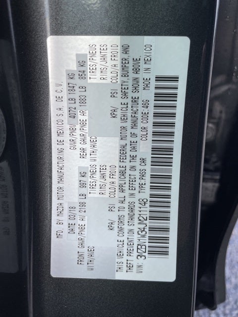 EQUIPPED WITH Premium Equipment Package, 4-Wheel Disc Brakes, 9 Speakers, ABS brakes, Air Conditioning, Alloy wheels, AM/FM radio: SiriusXM, Automatic temperature control, Bose 9 Speaker Surround Sound Audio System, Brake assist, Bumpers: body-color, Driver door bin, Driver vanity mirror, Dual front impact airbags, Dual front side impact airbags, Electronic Stability Control, Emergency communication system: MAZDA CONNECT, Exterior Parking Camera Rear, Four wheel independent suspension, Front anti-roll bar, Front Bucket Seats, Front Center Armrest, Front dual zone A/C, Front fog lights, Front reading lights, Fully automatic headlights, Heads-Up Display, Heated door mirrors, Heated front seats, Illuminated entry, Leather Shift Knob, Low tire pressure warning, Machine Gray Metallic Paint Charge, Occupant sensing airbag, Outside temperature display, Overhead airbag, Overhead console, Panic alarm, Passenger door bin, Passenger vanity mirror, Perforated Leather Seat Trim, Power door mirrors, Power driver seat, Power moonroof, Power steering, Power windows, Radio data system, Radio: AM/FM/HD Audio System, Rain sensing wipers, Rear anti-roll bar, Rear seat center armrest, Rear window defroster, Remote keyless entry, Speed control, Speed-sensing steering, Split folding rear seat, Spoiler, Steering wheel mounted audio controls, Tachometer, Telescoping steering wheel, Tilt steering wheel, Traction control, Trip computer, Turn signal indicator mirrors, Variable Heated Reclining Front Bucket Seats, Variably intermittent wipers, and Wheels: 18 x 7.0J Dark Silver Finish Alloy.