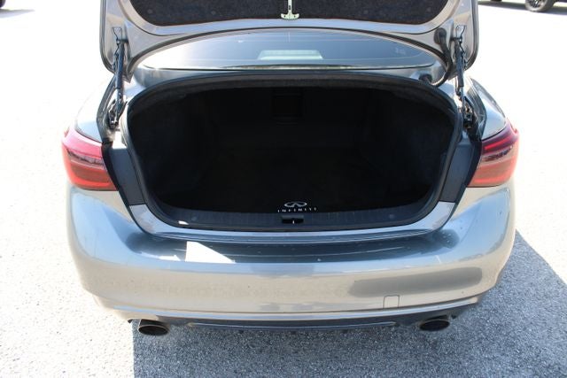 This Q50 is outfitted with a host of premium features that elevate the driving experience. Enjoy the convenience of hands-free connectivity, the ambiance of interior accent lighting, and the practicality of the Cargo Package, complete with a first aid kit and carpeted trunk mat. The sleek, gray exterior pairs beautifully with the well-appointed cabin, offering a harmonious blend of style and substance.