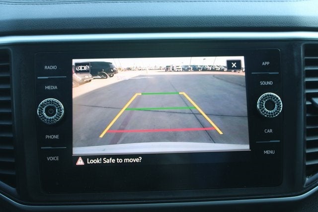 EQUIPPED WITH 3.60 Axle Ratio, 4-Wheel Disc Brakes, 6 Speakers, ABS brakes, Air Conditioning, Alloy wheels, AM/FM radio: SiriusXM with 360L, Auto-dimming Rear-View mirror, Automatic temperature control, Brake assist, Bumpers: body-color, Compass, Delay-off headlights, Driver door bin, Driver vanity mirror, Dual front impact airbags, Dual front side impact airbags, Electronic Stability Control, Emergency communication system: VW Car-Net services (capabilities require enrollment or subscription), Exterior Parking Camera Rear, Four wheel independent suspension, Front anti-roll bar, Front Bucket Seats, Front Center Armrest, Front dual zone A/C, Front fog lights, Front reading lights, Fully automatic headlights, Heated Comfort Front Bucket Seats, Heated door mirrors, Heated front seats, Illuminated entry, Leather Shift Knob, Low tire pressure warning, Occupant sensing airbag, Outside temperature display, Overhead airbag, Overhead console, Panic alarm, Passenger door bin, Passenger vanity mirror, Perforated V-Tex Leatherette Seating Surfaces, Power door mirrors, Power driver seat, Power Liftgate, Power steering, Power windows, Radio data system, Radio: MIB3 Composition Media w/8 Touchscreen, Rain sensing wipers, Rear anti-roll bar, Rear reading lights, Rear seat center armrest, Rear window defroster, Rear window wiper, Remote keyless entry, Roof rack: rails only, Security system, Speed control, Speed-sensing steering, Split folding rear seat, Spoiler, Standard Suspension, Steering wheel mounted audio controls, Tachometer, Telescoping steering wheel, Tilt steering wheel, Traction control, Trip computer, Turn signal indicator mirrors, Variably intermittent wipers, and Wheels: 20 5-Spoke Silver Alloy (CQ0)