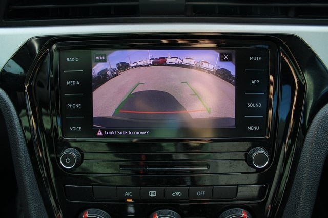 EQUIPPED WITH Cloth, 17 x 7J 10-Spoke Alloy Wheels, 4-Wheel Disc Brakes, 6 Speakers, ABS brakes, Air Conditioning, Alloy wheels, AM/FM radio: SiriusXM, Brake assist, Bumpers: body-color, Cloth Seating Surfaces, Delay-off headlights, Driver door bin, Driver vanity mirror, Dual front impact airbags, Dual front side impact airbags, Electronic Stability Control, Emergency communication system: VW Car-Net services (capabilities require enrollment or subscription), Exterior Parking Camera Rear, Four wheel independent suspension, Front anti-roll bar, Front Bucket Seats, Front Center Armrest, Front Comfort Seats, Front reading lights, Fully automatic headlights, Heated door mirrors, Illuminated entry, Leather Shift Knob, Leather steering wheel, Low tire pressure warning, Occupant sensing airbag, Outside temperature display, Overhead airbag, Overhead console, Panic alarm, Passenger door bin, Passenger vanity mirror, Power door mirrors, Power steering, Power windows, Radio data system, Radio: Composition Media w/Touchscreen, Rear anti-roll bar, Rear seat center armrest, Rear window defroster, Remote keyless entry, Speed control, Speed-sensing steering, Split folding rear seat, Steering wheel mounted audio controls, Tachometer, Telescoping steering wheel, Tilt steering wheel, Traction control, Trip computer, Turn signal indicator mirrors, and Variably intermittent wipers.