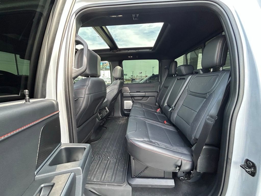 Equipped with Equipment Group 801A Standard, F-150 Raptor, 4D SuperCrew, 3.5L V6 EcoBoost, 10-Speed Automatic, 4WD, White Metallic, Black Leather, Navigation system: Connected Navigation, 14 Speakers, 17 Cast Aluminum Wheels, 4-Wheel Disc Brakes, ABS brakes, Adjustable pedals, Air Conditioning, Alloy wheels, AM/FM radio: SiriusXM with 360L, Auto High-beam Headlights, Auto tilt-away steering wheel, Auto-dimming door mirrors, Auto-dimming Rear-View mirror, Automatic temperature control, Brake assist, Bumpers: body-color, Compass, Delay-off headlights, Driver door bin, Driver vanity mirror, Dual front impact airbags, Dual front side impact airbags, Electronic Locking w/4.10 Axle Ratio, Electronic Stability Control, Emergency communication system: SYNC 4 911 Assist, Front anti-roll bar, Front Bucket Seats, Front Center Armrest, Front dual zone A/C, Front fog lights, Front License Plate Bracket, Front reading lights, Front wheel independent suspension, Fully automatic headlights, Garage door transmitter, Heads-Up Display, Heated door mirrors, Heated front seats, Heated rear seats, Heated steering wheel, Illuminated entry, Internet access capable: FordPass Connect 5G, Lane Departure Warning System, Leather steering wheel, Leather Trimmed Seats, Low tire pressure warning, Memory seat, Occupant sensing airbag, Outside temperature display, Overhead airbag, Overhead console, Panic alarm, Passenger door bin, Passenger vanity mirror, Pedal memory, Power door mirrors, Power driver seat, Power passenger seat, Power steering, Power windows, Radio data system, Radio: B&O Unleashed Sound System by Bang & Olufsen, Rain sensing wipers, Rear reading lights, Rear step bumper, Rear window defroster, Remote keyless entry, Security system, Speed control, Speed-sensing steering, Split folding rear seat, Steering wheel memory, Steering wheel mounted audio controls, SYNC 4 w/Enhanced Voice Recognition, Tachometer, Telescoping steering wheel, Tilt steering wheel, Tough Bed Spray-In Bedliner, Traction control, Trip computer, Turn signal indicator mirrors, Twin Panel Moonroof, Variably intermittent wipers, and Ventilated front seats.